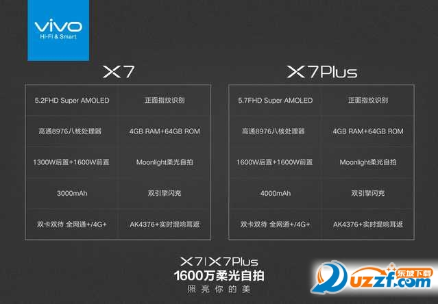 这就是我们带给大家的vivo X7和X7Plus。X7:5.2英吋,1600W前置,Moonlight柔光自拍,3000mAh;X7Plus:5.7英吋,1600W后置+1600W前置,Moonlight柔光自拍,4000mAh。