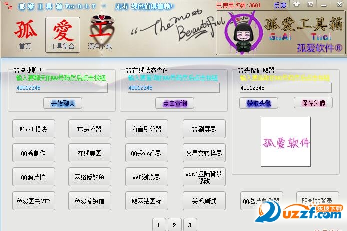 以网络小工具为主的一款软件,包含着各种各样的软件,还有天气查询等;还有通常使用的QQ快捷聊天,QQ秀制作,免费发短信,刷屏器等一系列小巧且实用的软件;集合了各种各样的实用软件,让您不再在网上搜索寻找,直接在工具箱就可找到!方便快捷又省事。