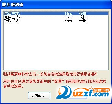 4、首次登陆时会弹出服务器测速窗口,测速需要8秒钟左右,系统会自动选择最优的行情服务器。