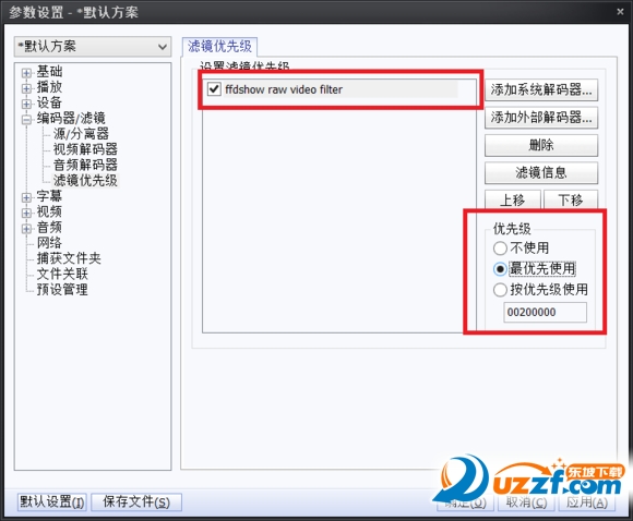 参数设置(快捷键F5)-编码器/滤镜-滤镜优先级-添加系统解码器-ffmpeg raw video filter-确定