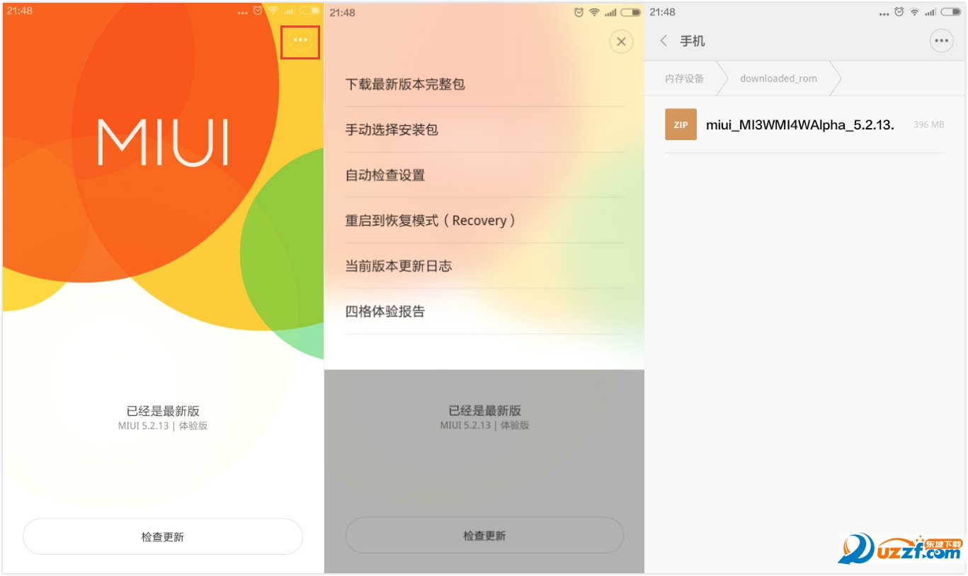 MIUI 6:点右上角“...”选择“手动选择安装包” ,然后选择 zip 包。