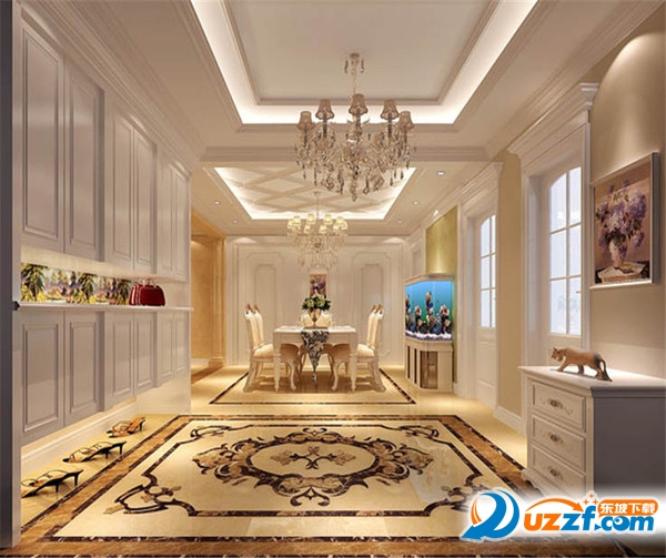 玄关欧式装修效果图,白色底柜提升空间档次,地板的花纹大气奢华,五角柜上的摆件十分霸气。