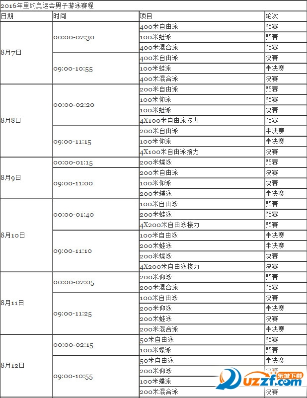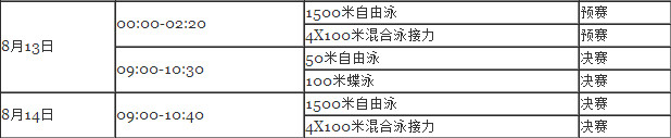 2016年里约奥运会男子游泳赛程安排及直播时间表