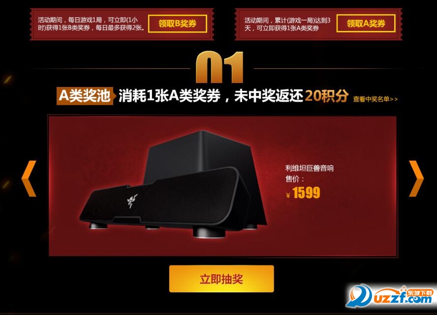 消耗A级抽奖券和B级抽奖券可分别在A类抽奖池和B类抽奖池中进行抽奖,幸运玩家可将背包、鼠标、耳机、键盘等豪华实物外设收入囊中!A类奖池中含有雷神G150S-火麒麟版、黑寡妇蜘蛛幻彩版键盘、黑寡妇蜘蛛竞技幻彩版键盘、利维坦巨兽音响;B奖池内含有雷神铠甲背包-CF版、曼巴眼镜蛇竞技版鼠标、太攀皇蛇白色鼠标、北海巨妖耳机和重装甲虫速度版-标准版。每张奖券可抽取1次,抽取次数越多,中奖几率越大。如未中奖,A类和B类奖池抽奖将分别返还20积分和5积分。