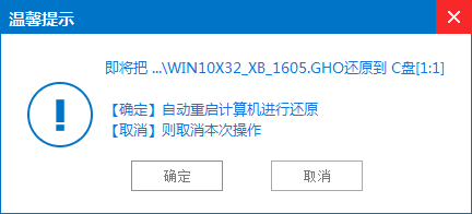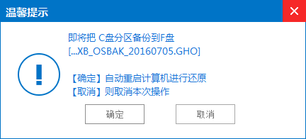 2、在弹出的提示框中确认系统盘区以及备份目标盘区无误后再次点击“确定”按钮,电脑将会进入重启状态并开始进行系统一键备份;