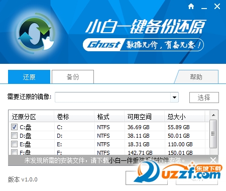 第一步:下载打开小白一键备份还原系统软件,默认选项卡在“还原”功能按钮下,如图看到的需要还原的镜像框内无win7备份文件的时候,可以通过右边的倒三角自动刷新扫描下电脑磁盘上的ghost文件,或者点击“选择”按钮进入电脑各个分区选定你需要还原的系统文件,然后选定;另外软件默认还原的目标分区是C盘,如果你的电脑系统不在C盘的请单独另行勾选系统的准确盘符,且遵循当前电脑系统在哪个分区就还原到哪个分区。