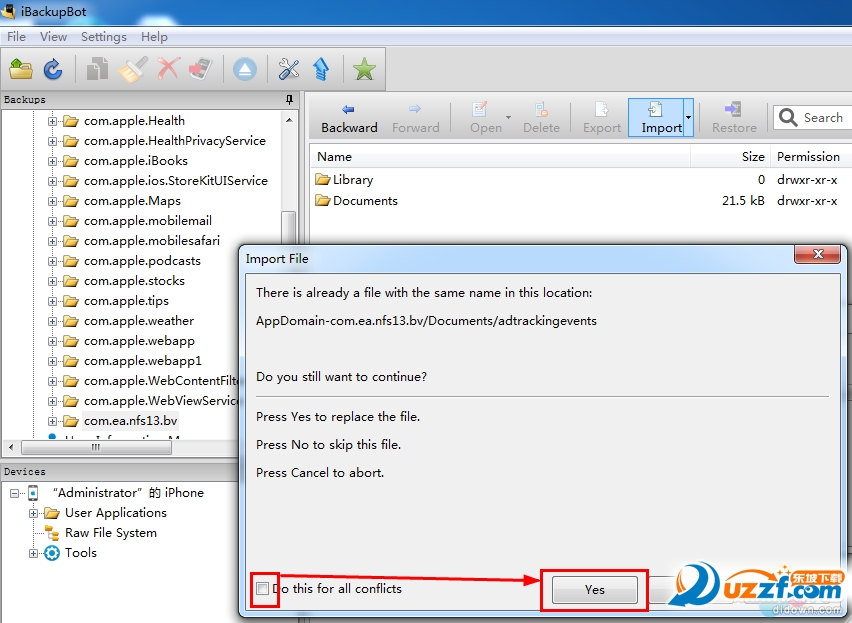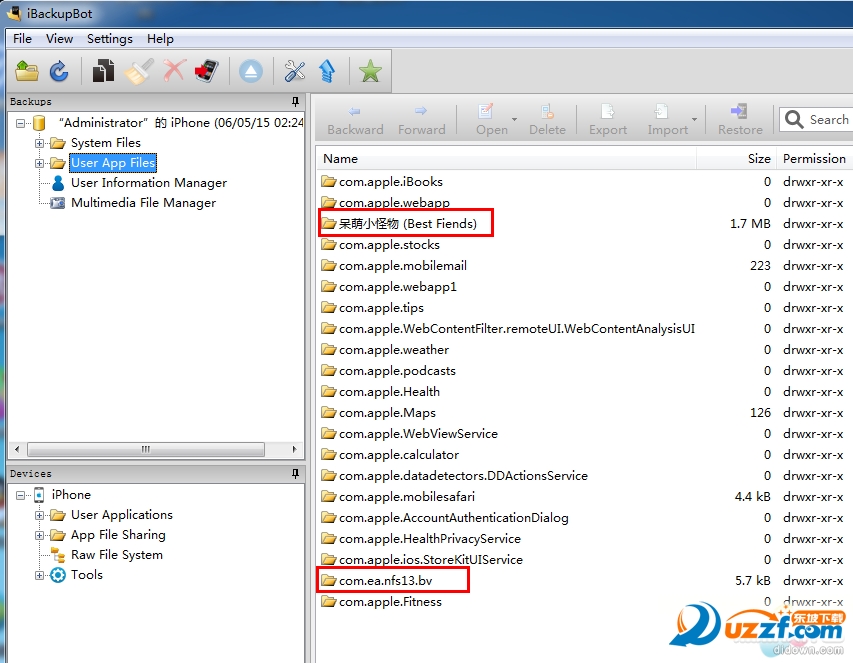 6. 备份完成之后。打开 iBackupBot for iTunes 。会提示三个确定的选择框。点击就是。直到出现下图,点选 User App Files (你的程序数据)找到 极品飞车 以及 呆萌小怪物