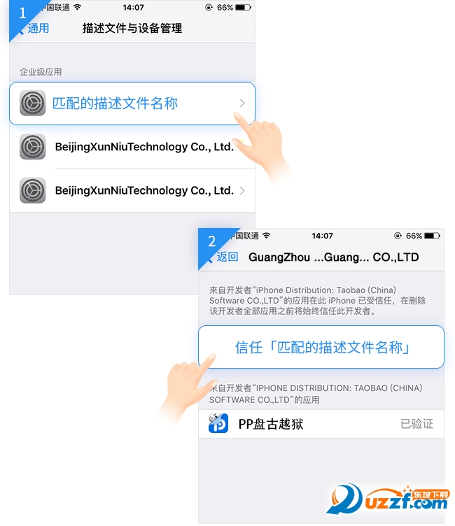 2、PP盘古越狱工具安装成功后,在「设置」-「通用」-「描述文件与设备管理」完成应用信任设置
