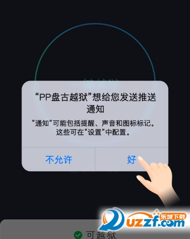 4、当系统提示【“PP盘古越狱”想给你推送通知】时,请点击【好】来允许推送
