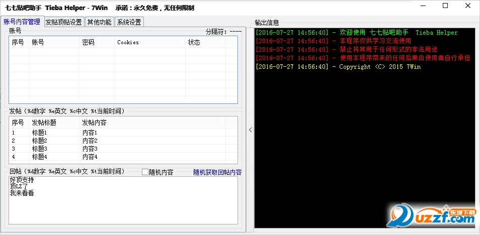 3:发贴并顶贴模式,就是先自动发贴,然后顶刚才发的贴子。被删后再发再顶。其他功能很好理解,自行测试。