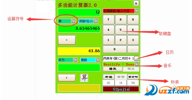 目前2.0版功能很多,能算加减乘除、开方等等和普通计算器使用方法一样,另,本计算器加入了秒表、日历(公历+农历)、放音乐的功能,还有一个便签。