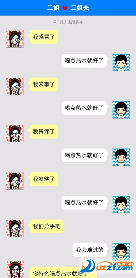 女生:我们分手吧。男生:我会难过。。女生:你喝点热水就好了