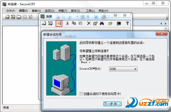 1. 完成客户端配置后,按菜单“文件”->“连接”,打开“连接”对话框,点击对话框上的“新建会话”按钮,打开新建会话向导,协议选择“SSH2”,如下图所示: