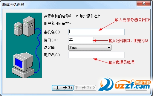 2. 点击“下一步”,在会话向导中进行如下配置: