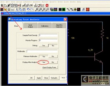 选择分析方法,由于这是一个大信号系统,我们寻找的是一个静态直流工作点,因此我们选择下图所示的DC operating point,将basic中的display after analysis项选择Yes,完成后点击OK。