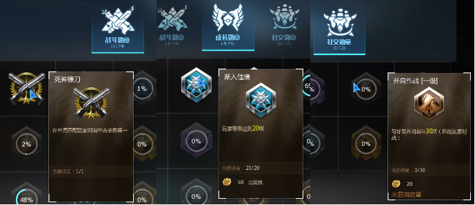 而成就系统包含了战斗勋章、成长勋章、社交勋章三个种类。顾名思义,战斗勋章是玩家在战斗中通过击杀、助攻、占点、双杀、三杀等行为能够获取到的勋章,而成长勋章则是玩家的等级、道具、装备等累计到一定的值可以获取到的勋章,社交勋章则是需要好友配合才能获得的。