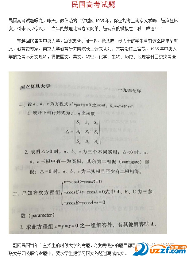 最近一个微信热帖“穿越回1936年,你还能考上南京大学吗”被疯狂转发,网友曝光了一组民国高考试卷图片,而且命题人为胡适、朱自清、钱穆、闻一多、华罗庚、陈寅恪等,答题人为钱钟书、季羡林、金庸等知名学者,想要知道那时的试卷是怎样的吗?来下载看看吧!