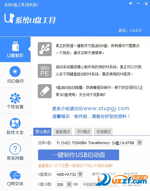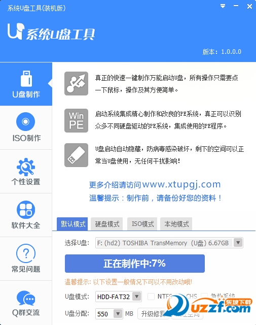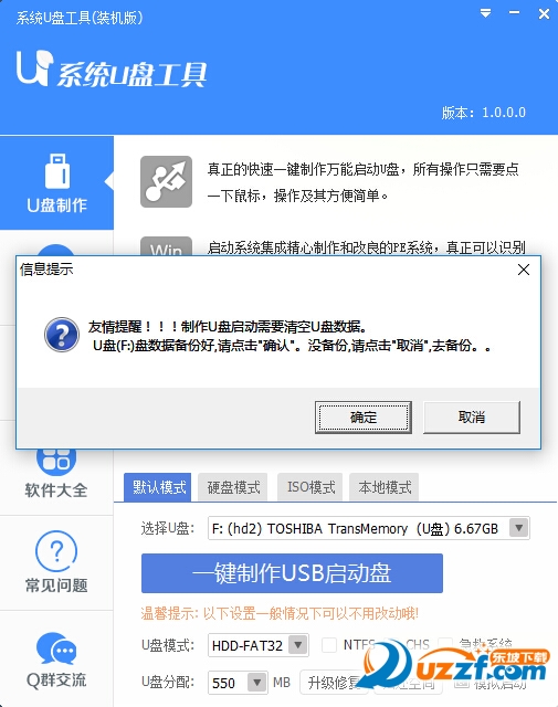 默认模式1.3:尽量退出杀毒软件和安全类软件以免制作失败,点击一键制作按钮,程序会提示是否继续,确认所选U盘无重要数据后点是开始制作。(注意:使用之前版本制作过的U盘如果制作失败请尝试先执行初始化U盘再进行制作。)