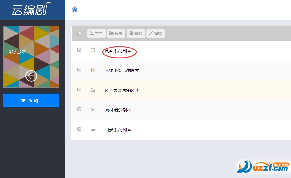云编剧已经帮您将项目分成剧本、人物小传、剧本大纲、素材、目录、统筹和剧本分解7个部分。