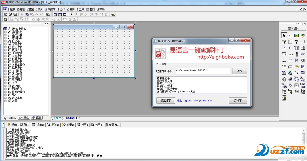 易语言5.5一键破解补丁是针对易语言5.5版本的完美破解补丁,本补丁非劫持,非支持库,内存偏移修改,和官方原版易语言没有区别。