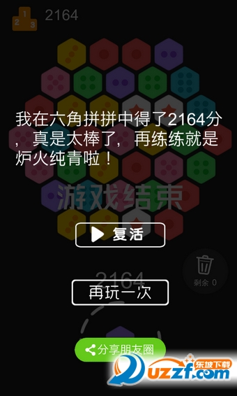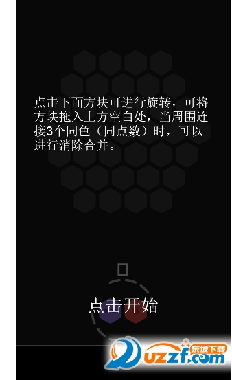 游戏界面是一个大六边形棋盘,六边形的每一边又由4个小六边形组成,构成共有37格的棋盘空间。玩家拖动系统自动输出的各种六边形组合置于大六边形的空白处,当大于等于3个相同颜色、点数相同的六边形碰到一起时就会相加升级并且消除得分,五角星六边形更有爆炸消除效果哟!而连续消除会有额外Combo加分。直到棋盘上再也无法摆下任意一个六边形组合的时候,游戏就会失败。
