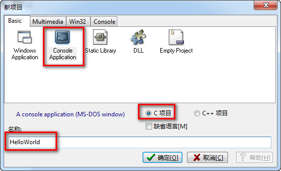 2、选择Console Application(字符界面,Windows为MS-DOS界面),选择“C项目”(如果写C++程序就选择“C++项目”),写入项目名称