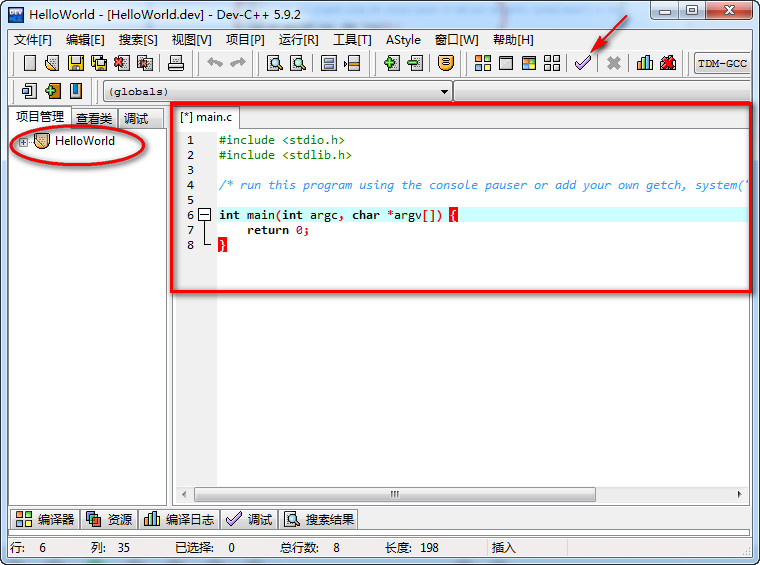 5、在main函数中输入语句“printf("Hello World!\n");”菜单“运行”中选择“编译”开始程序编译(快捷键"F9"),编译结果如下