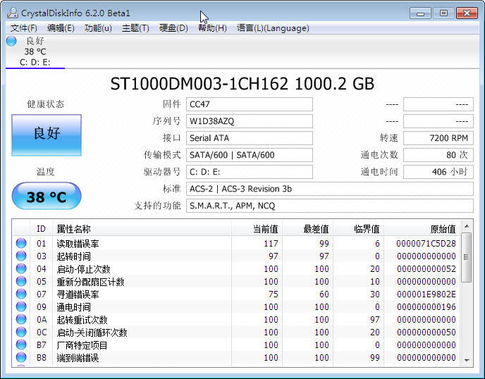 打开它,您就可以迅速读到本机硬盘的详细信息,包括接口、转速、温度、使用时间等.软件还会根据S.M.A.R.T的评分做出评估,当硬盘快要损坏时还会发出警报,支持简体中文。