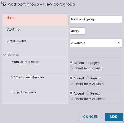 每个Holodeck环境都需要一个独立的(无上行链路)vSphere标准交换机和相应的端口组。