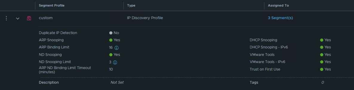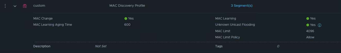 3.如果使用NSX端口组,请确保类型为“Overlay”,并允许VLAN 0到4094(或者至少允许站点A的VLAN 0、10 - 25以及站点B的VLAN 40 - 58)。通过导航到左侧导航栏中的“网络” --> “网段”选项卡,然后点击右侧的“配置文件”选项卡,点击“添加网段配置文件”,并根据以下内容选择配置文件,以此创建自定义网段配置文件,具体设置如下: