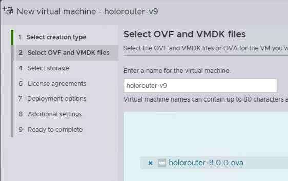 4.为虚拟机命名,并选择您之前下载的Holorouter OVA文件