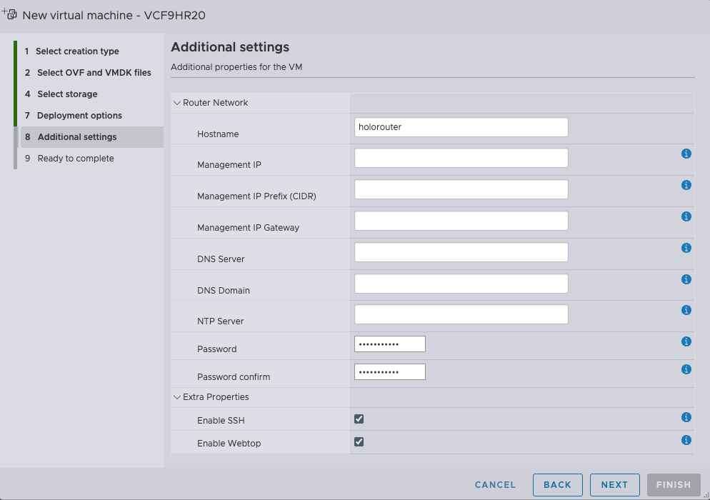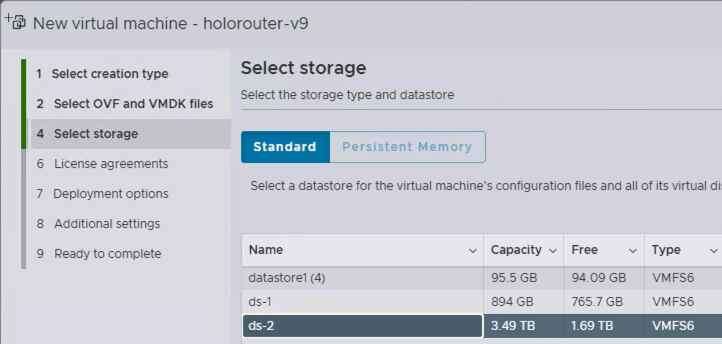 5.选择合适的存储和网络,以便部署你的全息甲板实例。你需要为管理选择一个(外部)端口组,然后为站点A和站点B选择另一个(中继)端口组 - 使用默认的站点配置,你可以有效地为两个站点使用相同的端口组(它们位于不同的VLAN和子网中)。