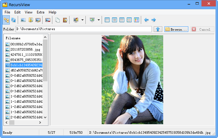 打开 RecursiView 后点击右边的 Browse 设置要查看的文件夹,然后确定,这时 RecursiView 会将这个文件夹内的所有图片,包括文件夹里面的文件夹的图片都列出来,然后点击左边在右边就可以预览了,是不是很方便呢?