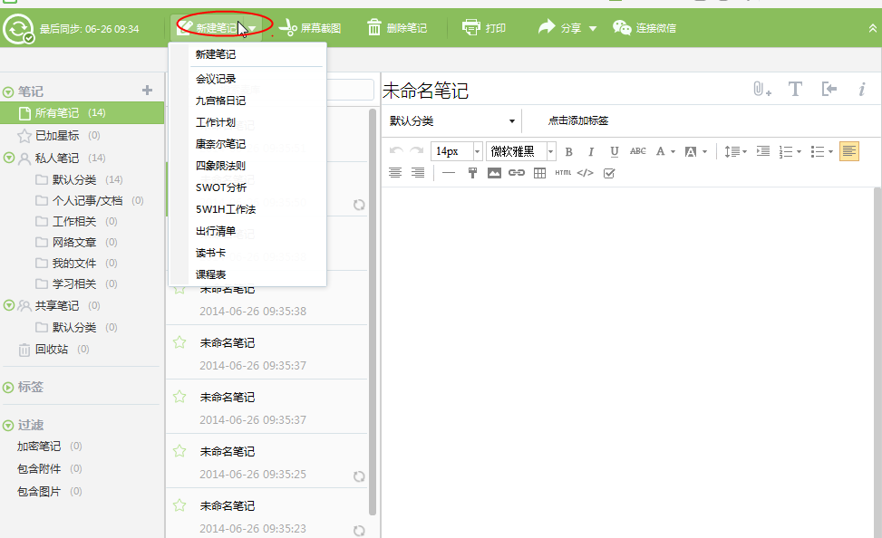 3、出现这样的就是安装完成之后的主界面,点击新建笔记,在这里选你喜欢的笔记类型,然后再新建的窗口试着写几个,这样他会自动的保存到左边的