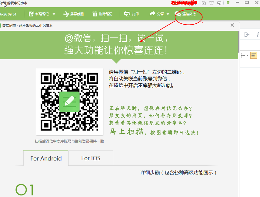 4、当你的文件写好了,可以点击【连接微信】,这样就能够把你的文章用二维码发给微信的朋友