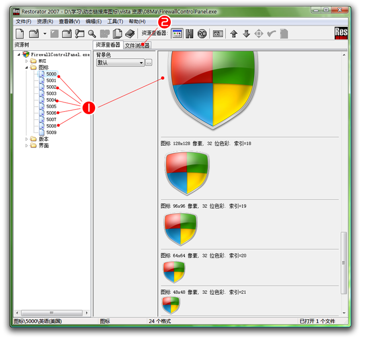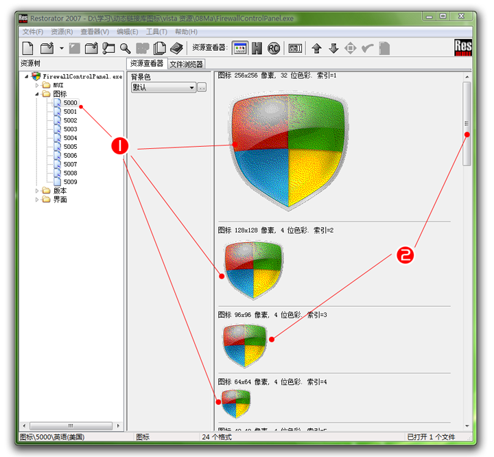 4. 选中图标_5000,可以在资源查看器看到ICON的信息(红1),可以看出来这个文件的图标格式是比较多的,往下拉(红2)就可以看到RGB/A的图像信息,目前看到的是16色信息 。