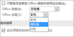 现在可以向 Project 2016 应用三种 Office 主题:彩色、深灰色和白色。 若要访问这些主题,请转到“文件”>“选项”>“常规”,然后单击“Office 主题”旁的下拉菜单。