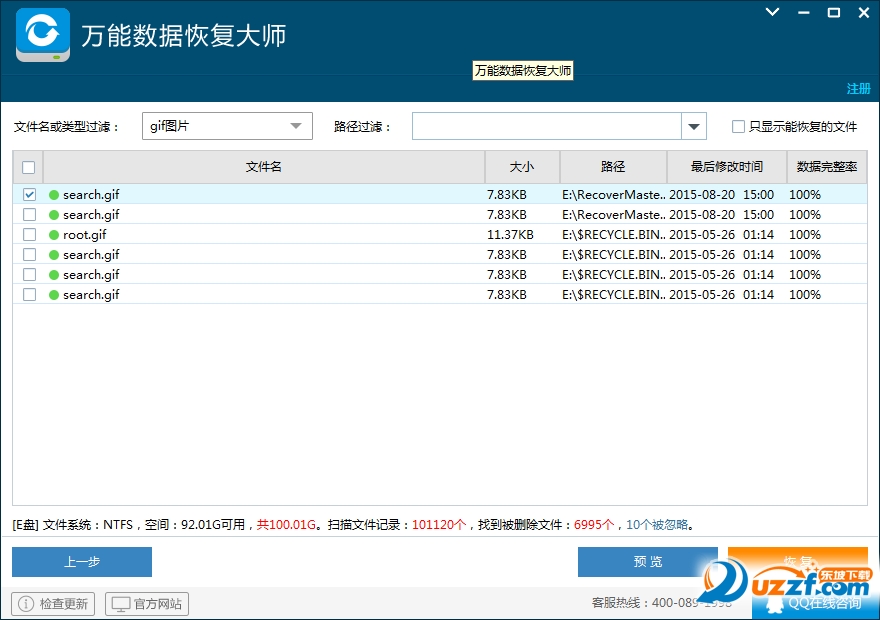 从扫描结果里搜索要恢复的文件,选择要恢复的文件,点击;恢复;按钮