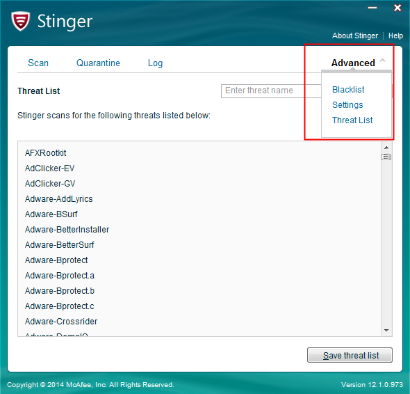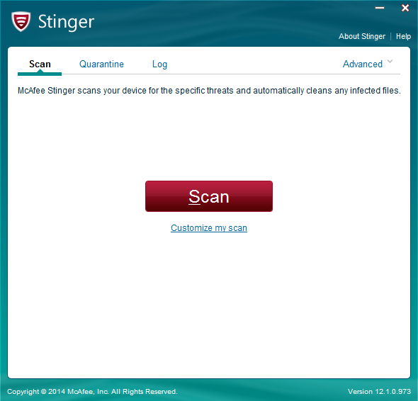 Stinger是一个独立的工具,用来检测和清除特殊的病毒。 这不是一个全面的反病毒产品的替代品,而是一个工具,协助管理员和用户处理受感染的系统。 Stinger采用下一代扫描引擎技术,包括进程扫描,数字签名DAT文件以及扫描性能优化。