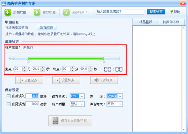 相信在平时使用手机的时候,希望自己的来电,或者短信铃声与众不同,那么快用这款软件,截取你喜欢的歌曲片段制作成铃声把!