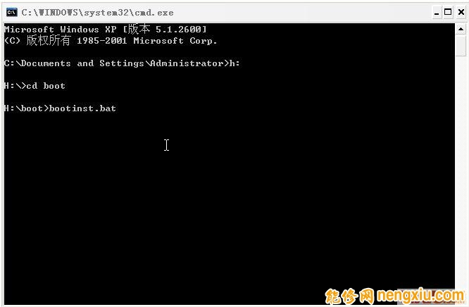 首先输入你优盘的盘符,我这里是h盘,输入h: 然后回车,接下来输入 cd boot 回车,进入到boot文件夹下,最后 bootinst.bat 回车,就会开始安装BT3,如下图: