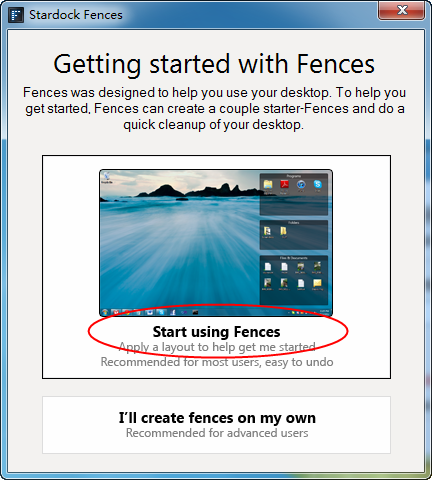 2、安装完成后点击【Start Using Fences】开始使用桌面美化软件(Fences)