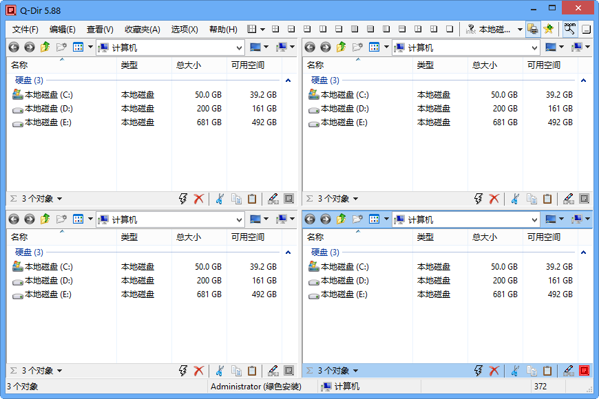 Q-Dir 是一款非常独特的资源管理器,特别适用于频繁在各个目录间跳跃复制粘贴的情况,因为,它有 4 个窗口!每个窗口都可以方便的切换目录,以不同颜色区分不同类型的文件,各窗口之间可以方便的拖放操作互相的文件。
