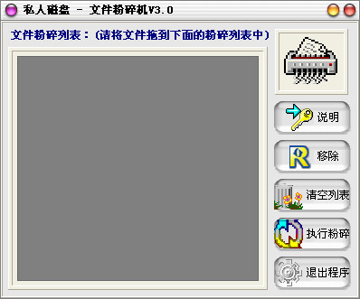 请将所要彻底删除的文件或目录拖动到文件粉碎列表中,单击“执行文件粉碎”按钮即可将所有选择的文件彻底删除。