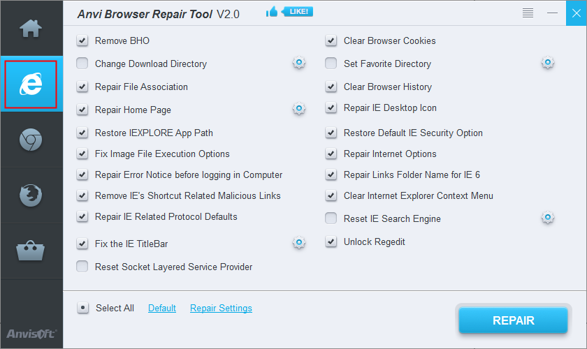 Browser Repair Tool是一款全方面的浏览器修复工具,可以修复众多浏览器使用时出现的问题。目前版本仅支持修复IE浏览器,火狐浏览器和谷歌浏览器的修复功能将会在后续版本中添加,请关注更新。