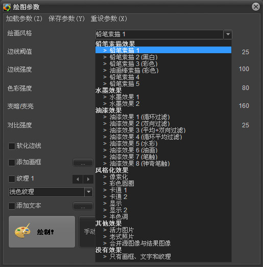 FotoSketcher 新版增加了很多功能,打开一张图片后会自动弹出绘制参数对话框 (Drawing parameters),每种方式也都可以调整很多参数,如颜色强度、明亮度、纹理设置等,还可以添加文本,支持中文输入,也支持批量处理。