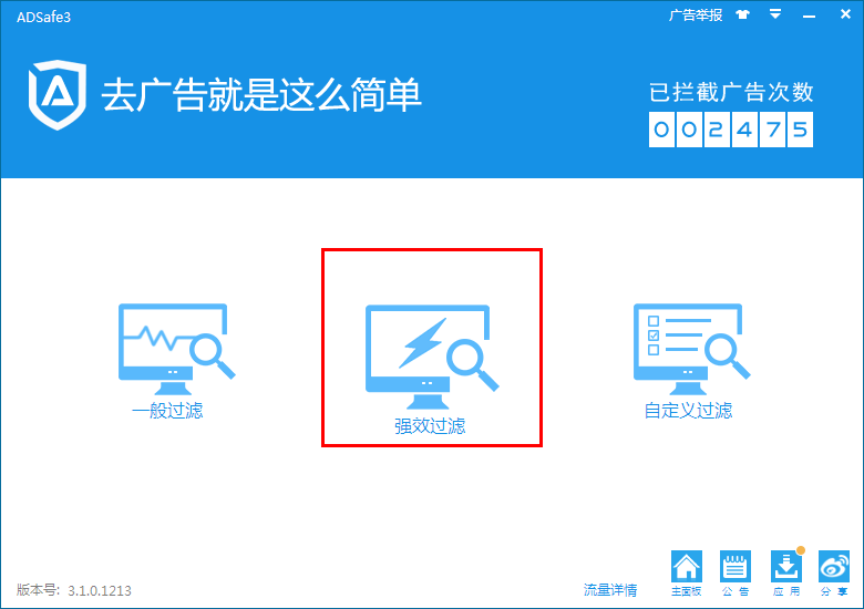 1、ADSafe3运行后,单击右下角托盘图标,弹出界面如下。在“首页”选项卡,点击“强效过滤”按钮,即可达到最佳广告过滤效果。