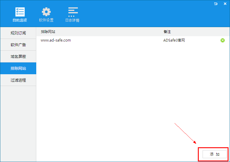 ② 排除网站:大多数过滤广告产品存在误杀现象,如果怀疑某网站被ADSafe3误杀,可尝试点击右下角的“添加”按钮,将该网站主域名放入“排除网站”选项卡里,并点击“确定“