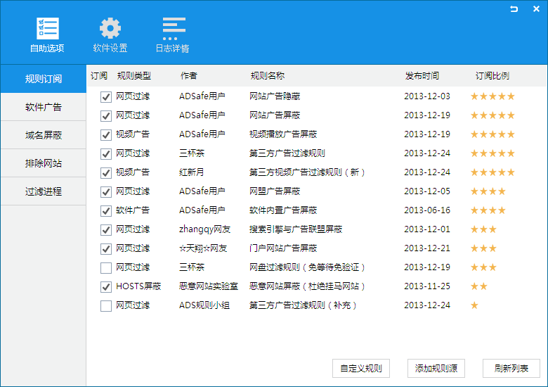 ① 规则订阅列表:用户可以根据自己的喜爱,勾选相对应的规则。在ADSafe3首页选择“自定义过滤”。如下图所示: