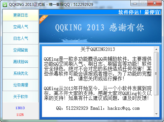 这是一个刷QQ空间访问量,日志浏览量立马见影的工具,它的超级功能可以实现离线挂QQ,QQ背景音乐获取,发布各种说说等功能。
